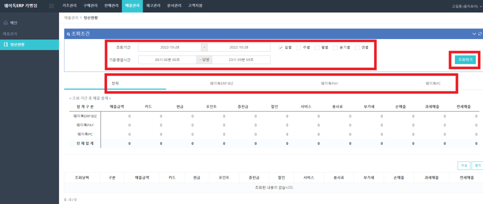 [상단메뉴]매출관리 항목에서 기간별, 시간별 매출을 종합적으로 조회할 수 있습니다.