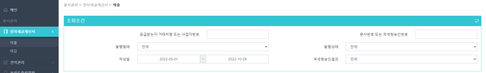 [왼쪽메뉴]전자세금계산서 에서 매출/매입별로 세금계산서 발행 내역을 조회합니다.