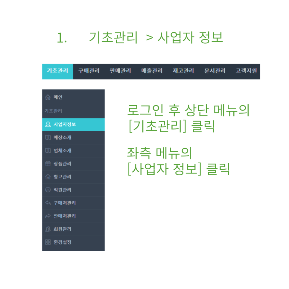 2. [기초관리] 의 좌측 메뉴에서 '사업자 정보'를 선택하세요.