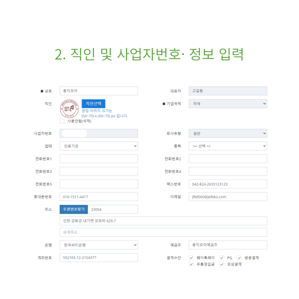 3. 상호·직인 등록 및 사업자 정보를 입력하세요.