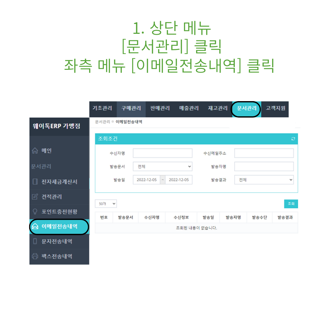 [문서관리] → <이메일 전송내역>으로 이동하세요.