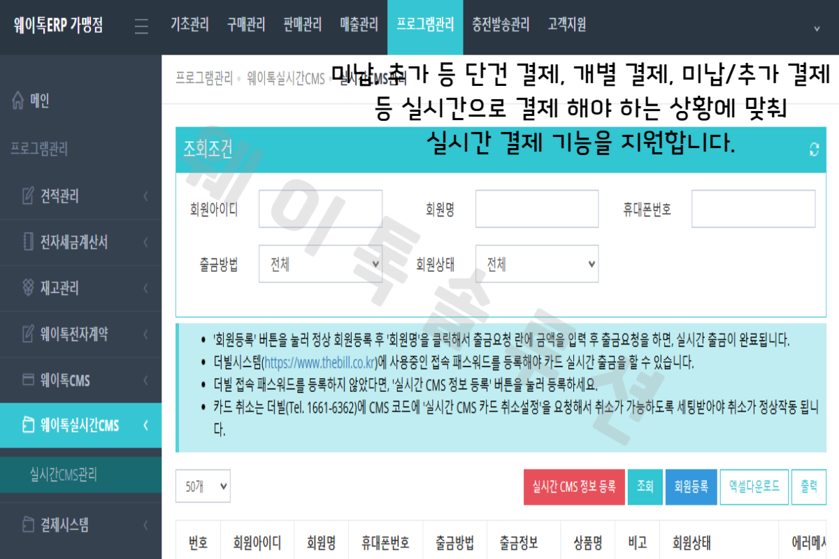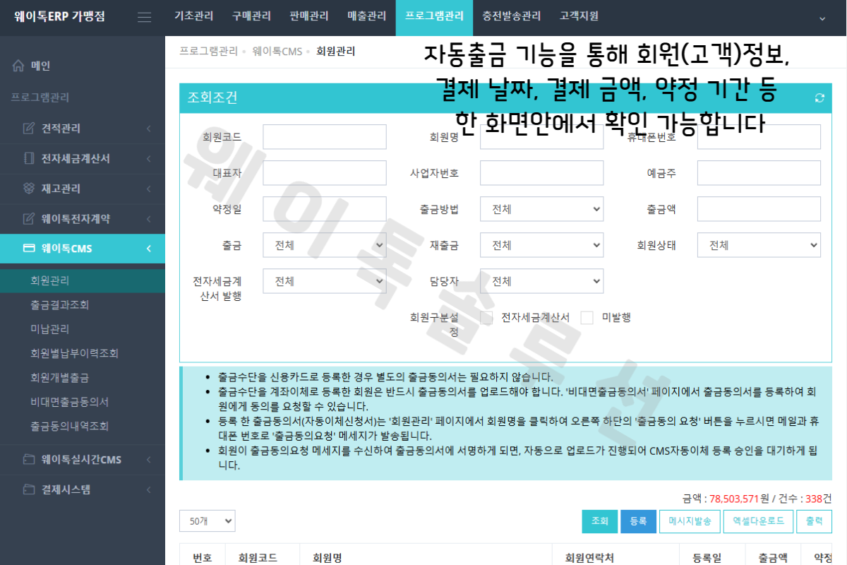 기본적인 자동출금 기능 외에도 회원관리 및 기타 업무 기능까지 구독사업에 고도화 기능을 추가하였습니다.