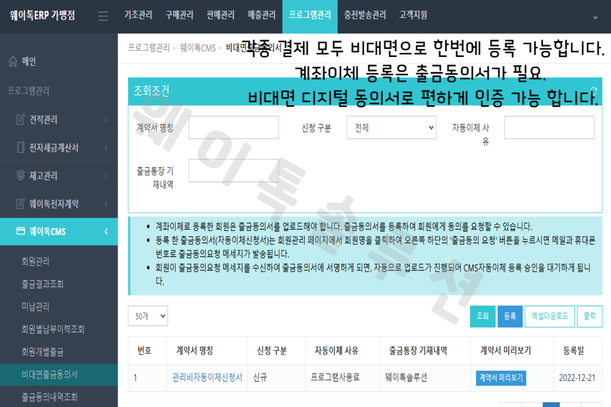 계좌이체의 경우에는 출금동의서가 필요하기에 비대면동의서를 통해 동의서를 작성 후, 등록됩니다.